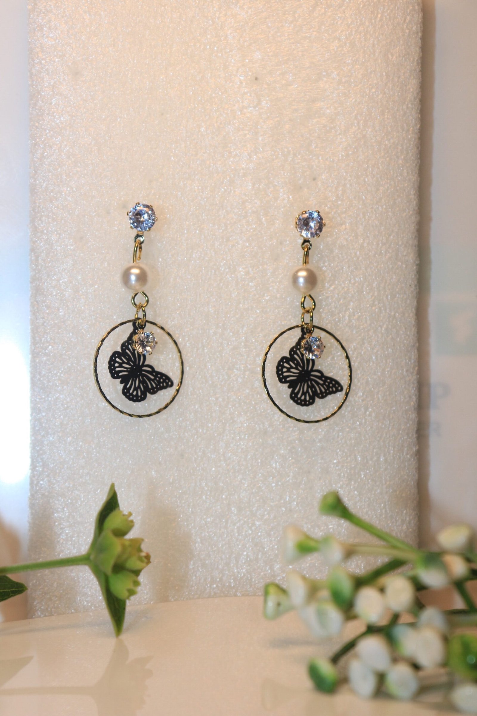 - Main Element: A textured gold-tone hoop encircles a delicate black filigree butterfly, creating a striking contrast.