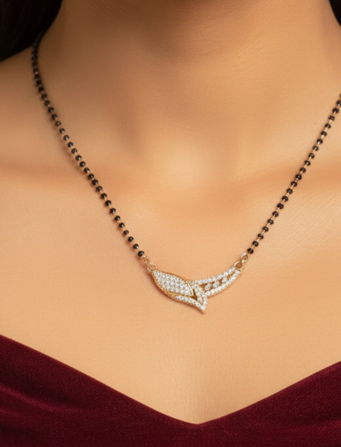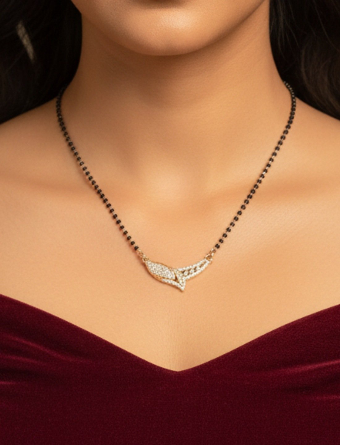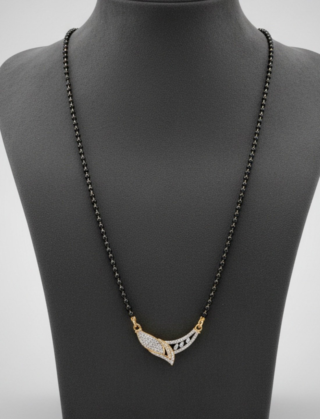 Modern Abstract Leaf Mangalsutra with sparkling CZ stones on classic black beads. Contemporary design, symbolic meaning, perfect for daily wear & special occasions.